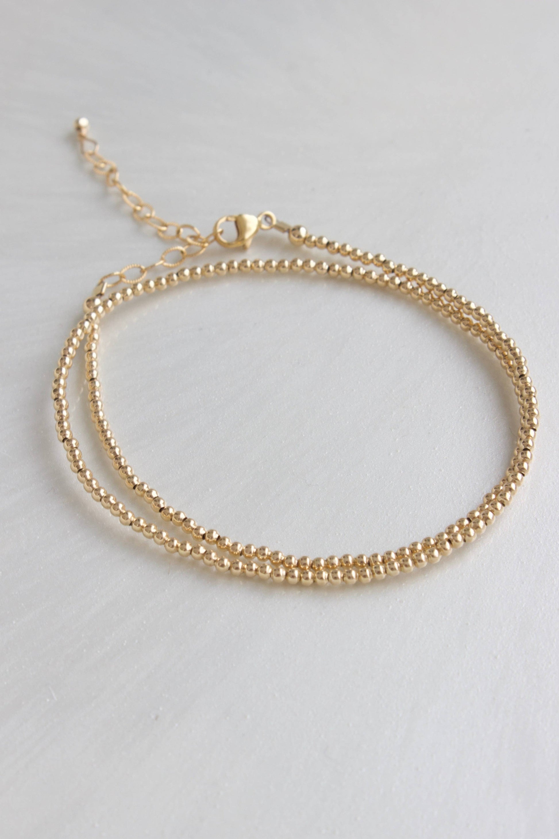 The Golden Double Wrap Bracelet is one of our number one best selling bracelets! The petite double wrap beaded bracelet is made up of 2mm beads and can be worn as a bracelet or a single layer choker necklace! Also available in Silver. Details: - Gold filled 2mm beads - Gold filled lobster clasp and end chain - 13" with 2" extender