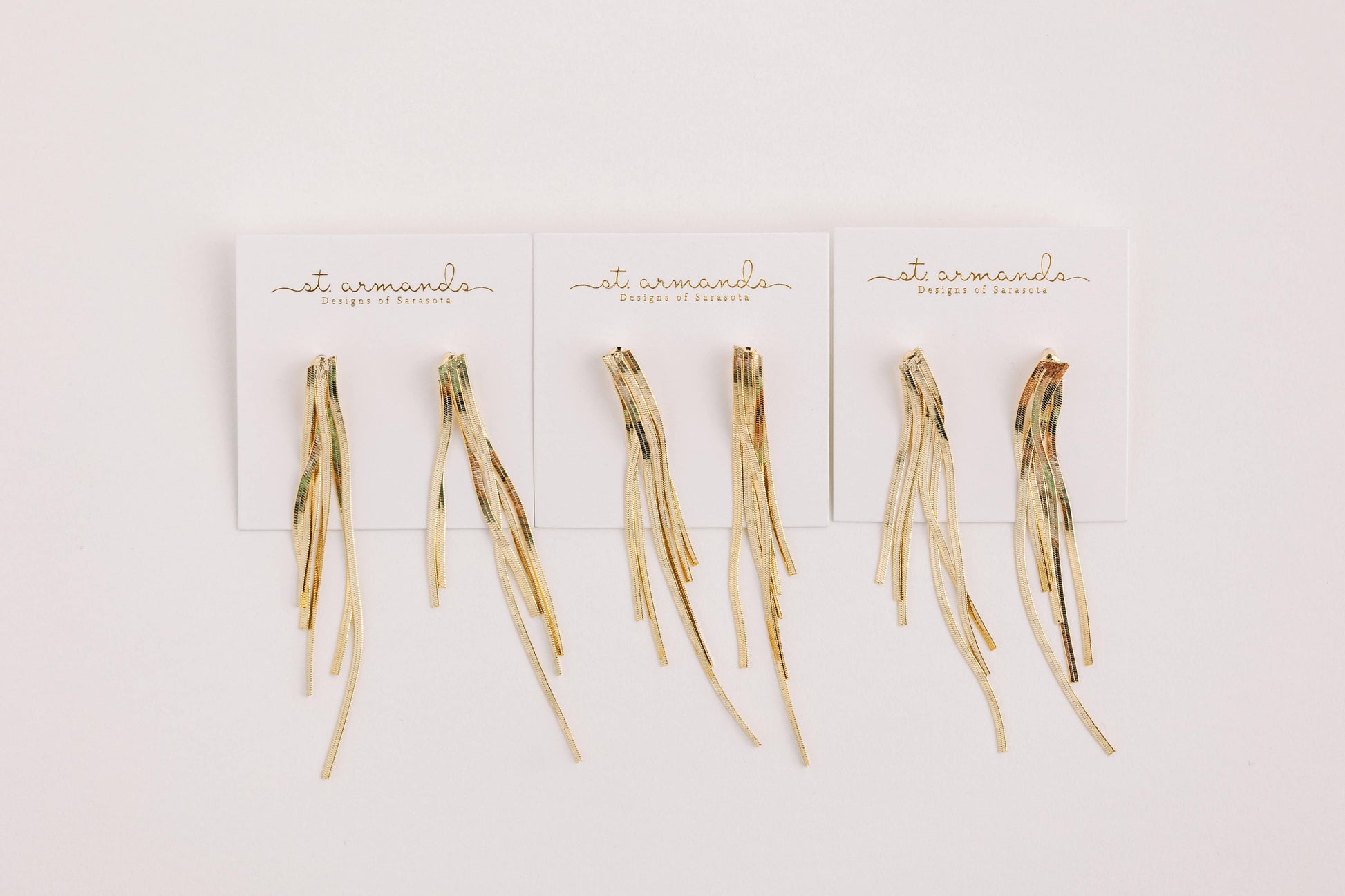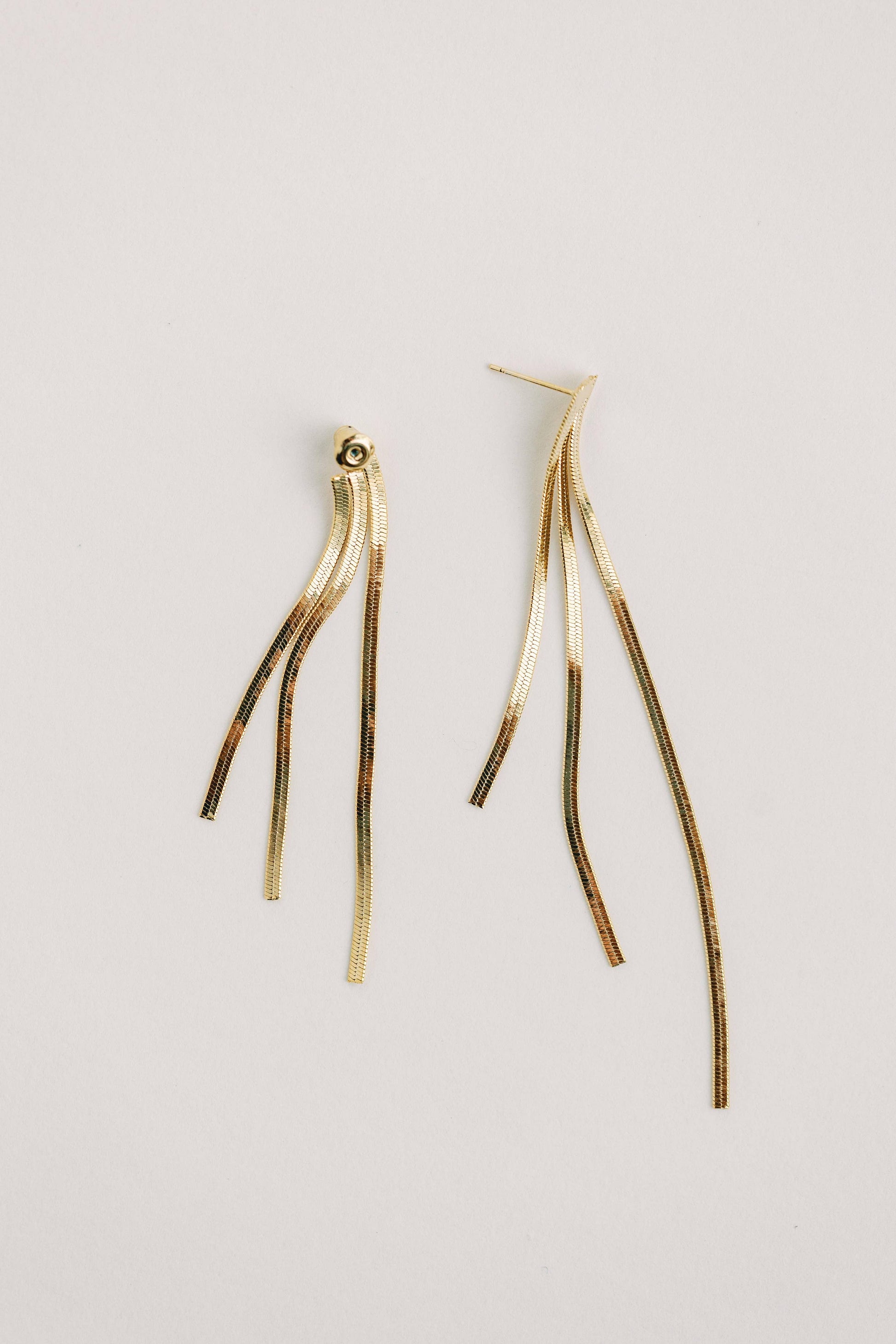 Add a sleek and modern touch of glamour to your holiday and christmas ensembles with these stunning minimalist skinny gold tassel statement earrings. These earrings feature delicate gold chains that gracefully cascade and catch the light, making them the perfect festive accessory.