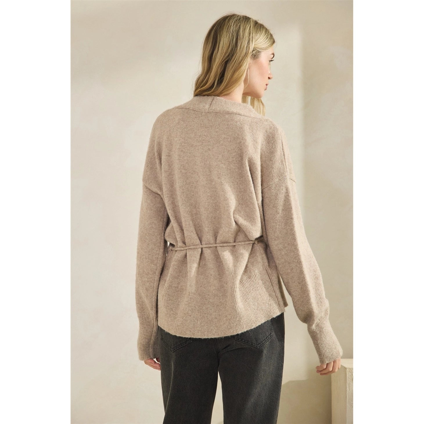 A soft knit cardigan designed with an easy, relaxed feel. Made from a cozy sweater knit with a subtle two-tone melange effect, this piece features an open front and a fixed self-tie waist for a simple, flattering finish. Dropped shoulders add to the laid-back fit, making it an effortless layering piece for everyday wear.