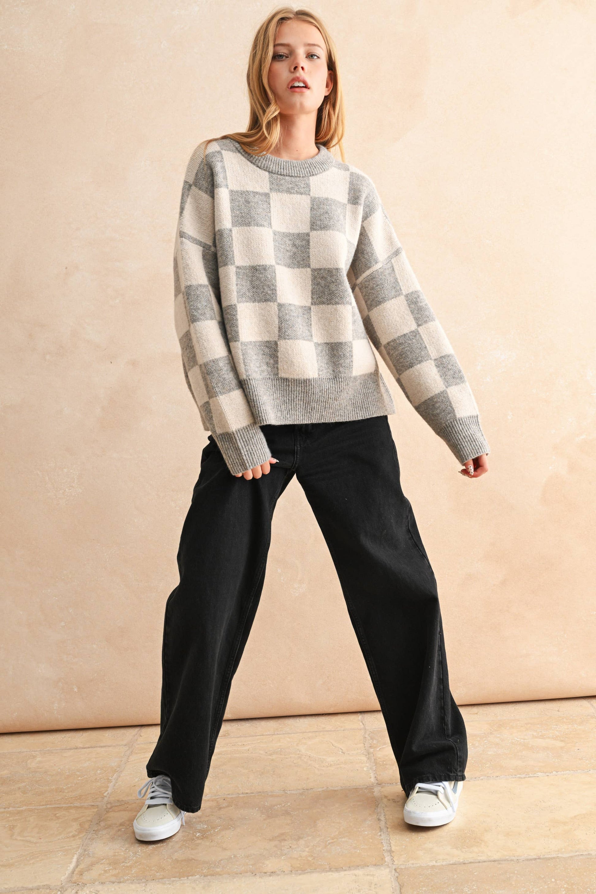 This cozy checker sweater brings timeless style and comfort to your everyday wardrobe, perfect for layering or wearing solo throughout the season.