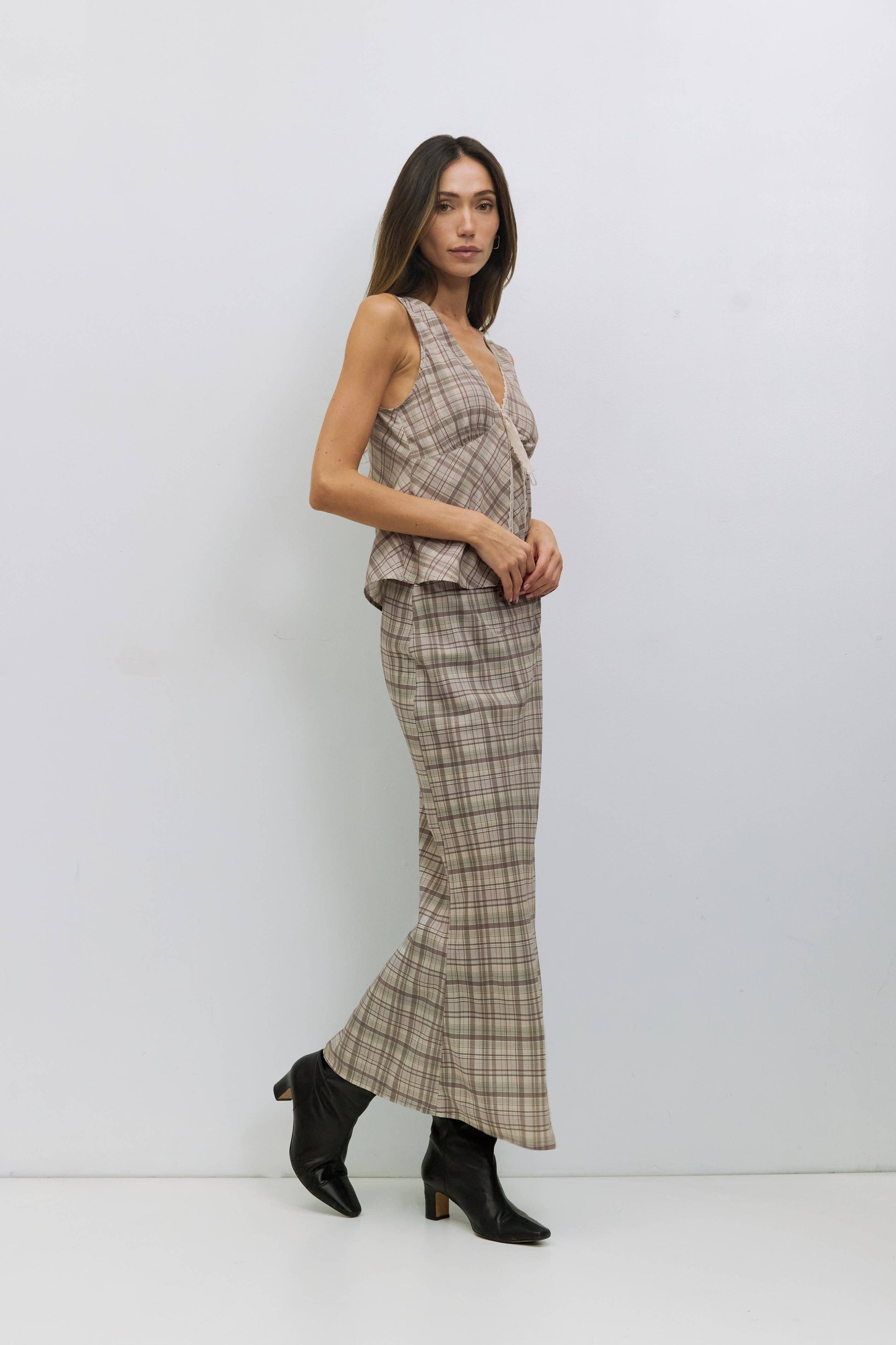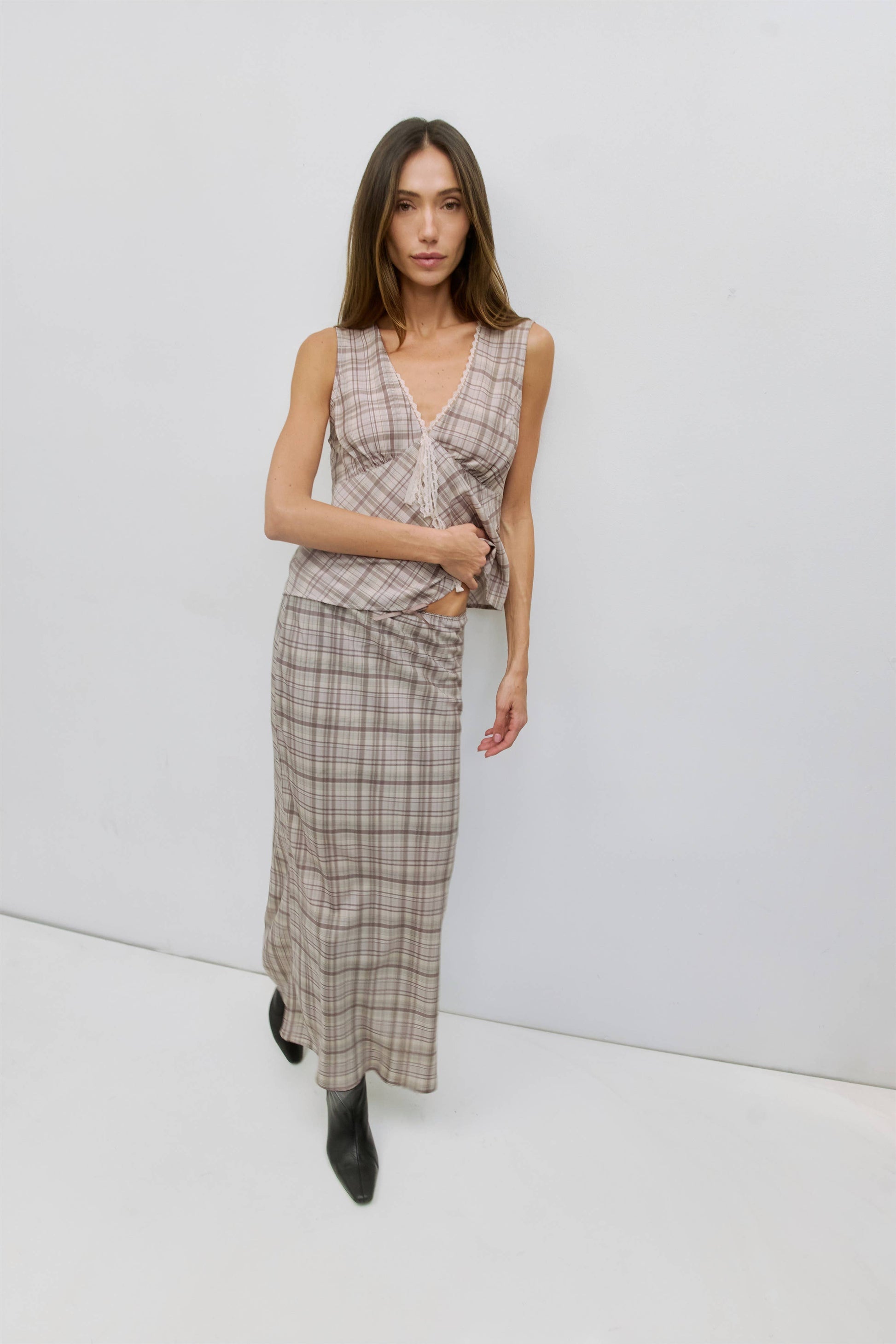 The Paxton Top is a relaxed sleeveless blouse featuring a V-neckline adorned with a delicate lace trim around the neckline and a lace front tie. Pair on its own or with the matching Paxton Skirt (SMR0055).